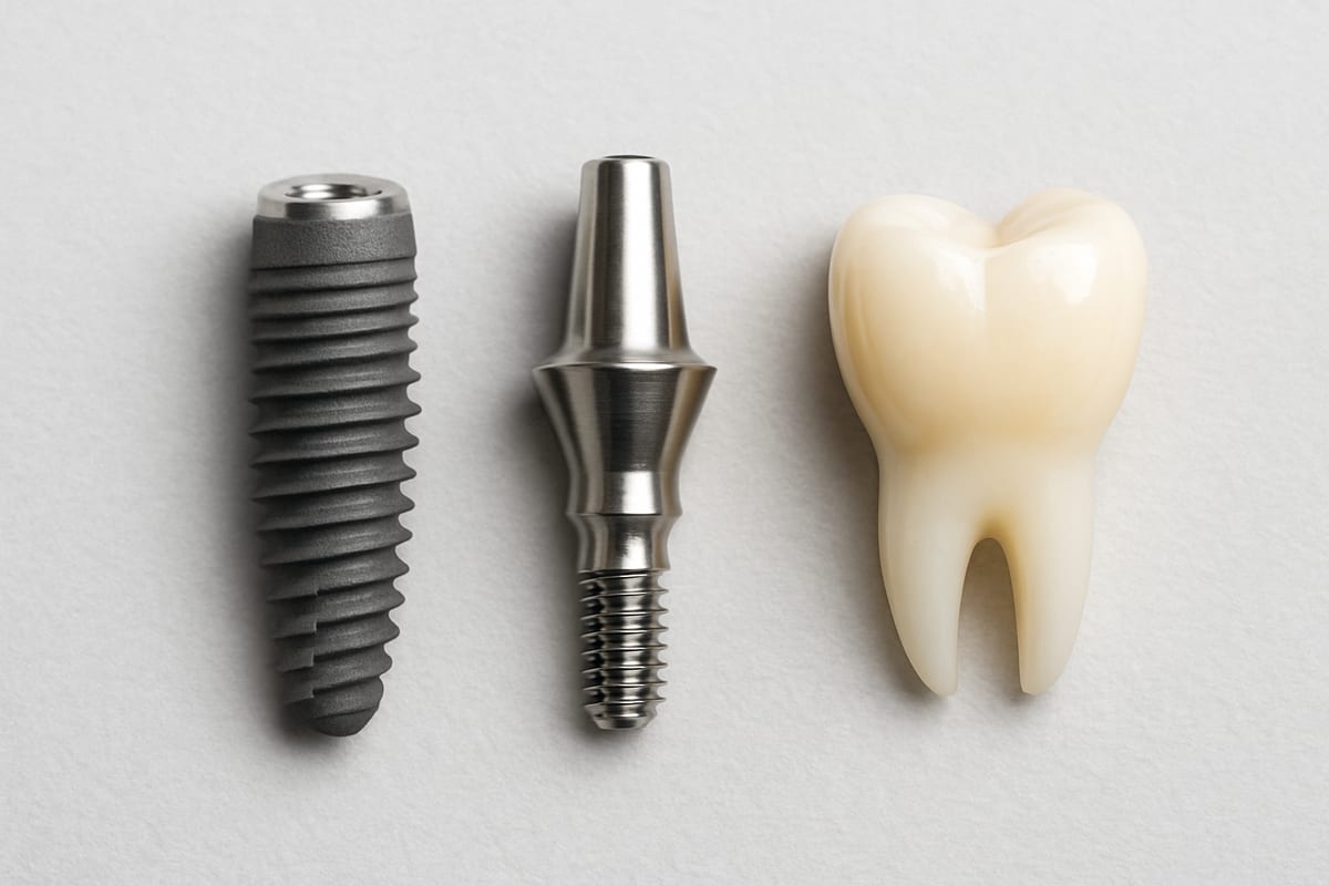 Dental implants typically have three core parts: the implant fixture (the root), the abutment (the connector), and the crown (the visible tooth). Together these parts replace a missing tooth from the bone up to the chewing surface, restoring function and appearance. Knowing each part helps you make better choices about materials, costs, and care.